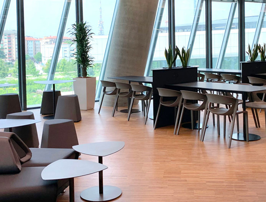 The stylistic code followed for the design of the Cafeteria’s furniture, which occupies an entire level of the Tower, is in perfect harmony with the unmistakable architecture that characterizes the skyline of Cityline with its unique silhouette, designed by the Zaha Hadid Architects studio.